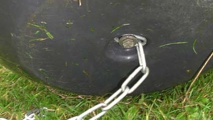 MineralRocker has a rounded bottom and can therefore be pushed relatively easily by the animals, possibly completely out of the fence, especially when placed on sloping terrain. However, this can easily be prevented! The instructions for use, which is part of the mounting kit supplied with MineralRockers, says, among other things, 'It is possible to tie the mineral feeder with a rope or alike by the bottom of the centre bolt if you anyway need to place it at sloping terrain or otherwise wish to fix it to avoid it slides away.' The picture shows how a chain can be attached to the centre bolt.