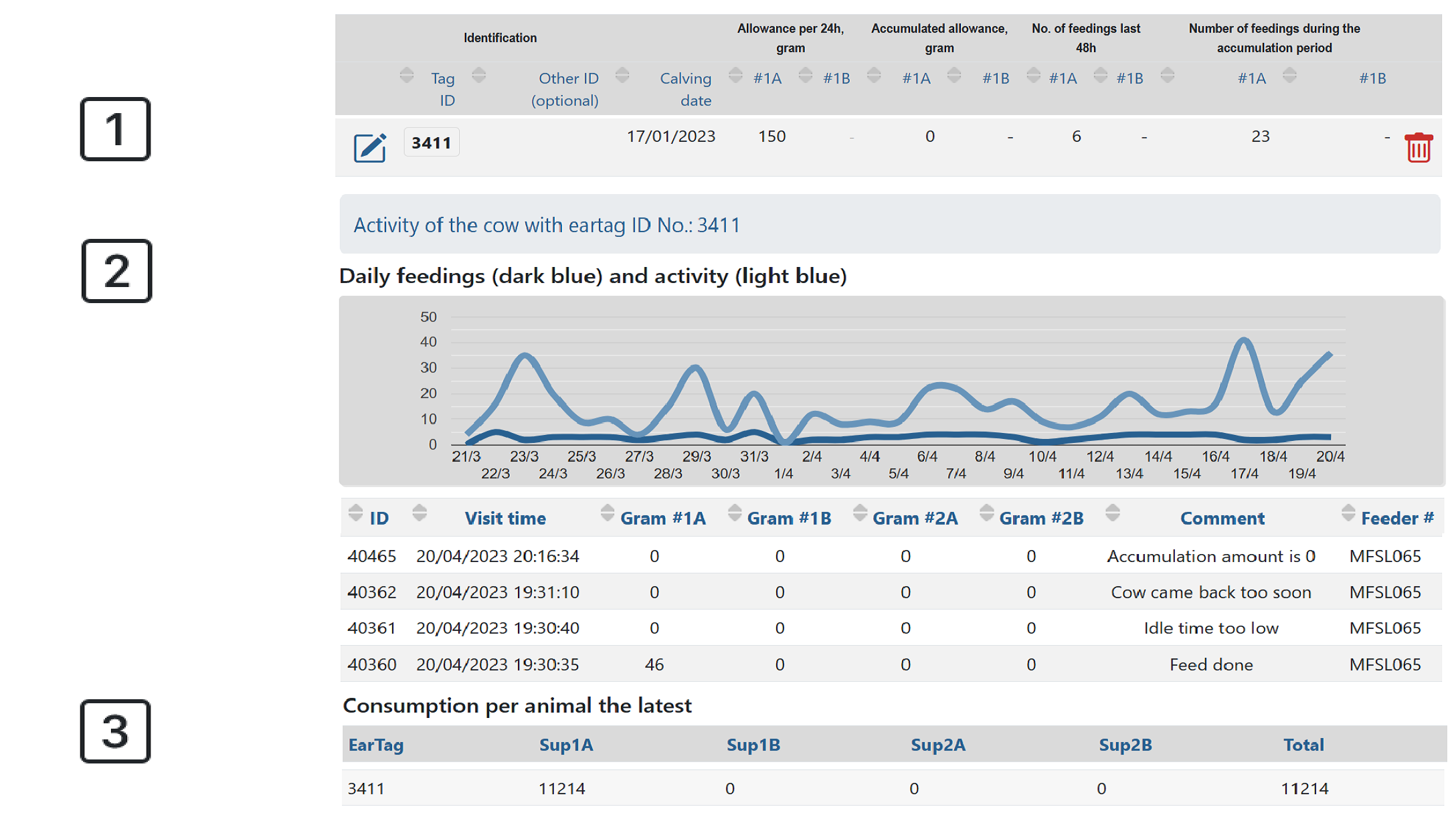 1. The information on cow no. 3411 on the cow list, e.g. calving date, and number of feedings in the last 48 hours and during the accumulation period, which in this case is 7 days.
