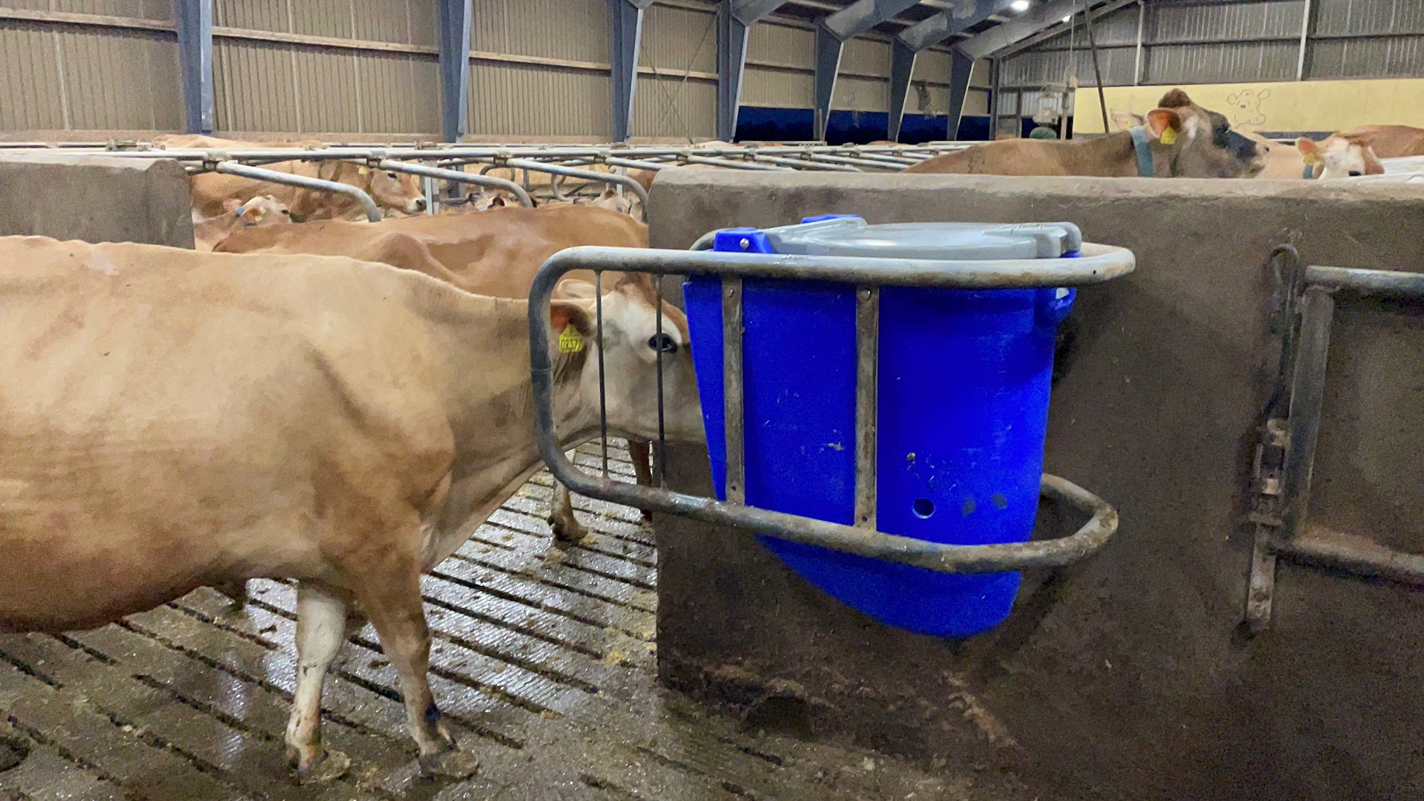 PitstopBASIS feeders are fitted on steel bars with the small mounting bracket in this French dairy herd with cows of the Normande breed. The amount of minerals in the TMR feed is reduced with 25%, and the group of 50-60 cows are in return given access to extra minerals on a free-choice basis from 2 PitstopBASIS feeders. This method accommodates cows with higher needs and avoids other cows being overfed with minerals. See an animated image montage from the herd here: